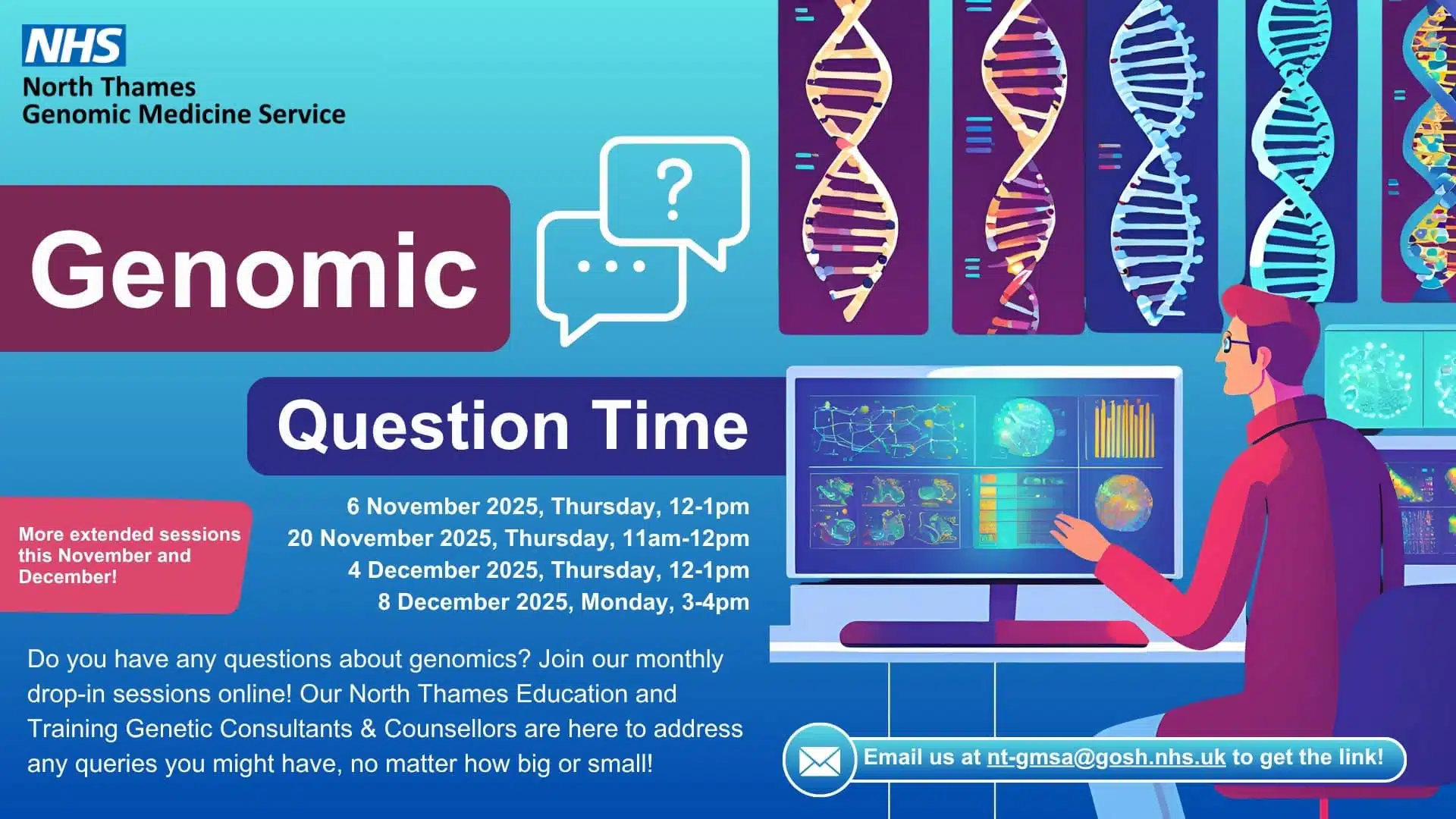 Come to our Genomic Question Time drop in sessions!