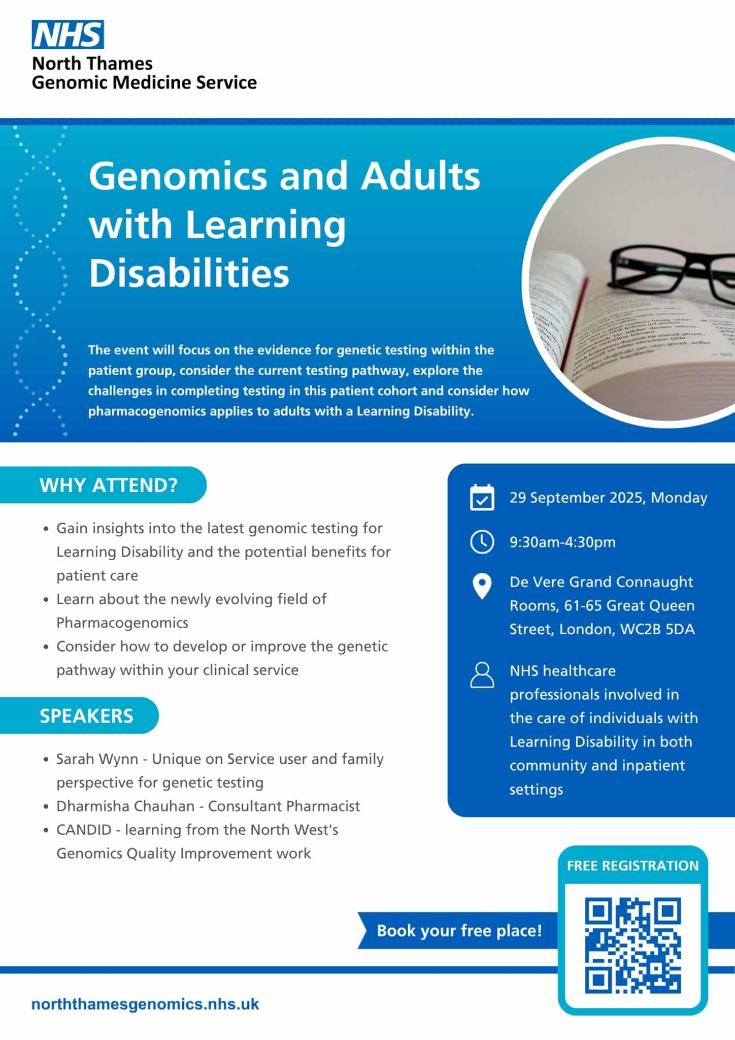 Click here to book your place!Join us for an educational event designed for NHS healthcare professionals involved in the care of adults with a Learning Disability / Intellectual Disability. The event will focus on the evidence for genetic testing within the patient group, consider the current testing pathway, explore the challenges in completing testing in this patient cohort and consider how pharmacogenomics applies to adults with a Learning Disability.